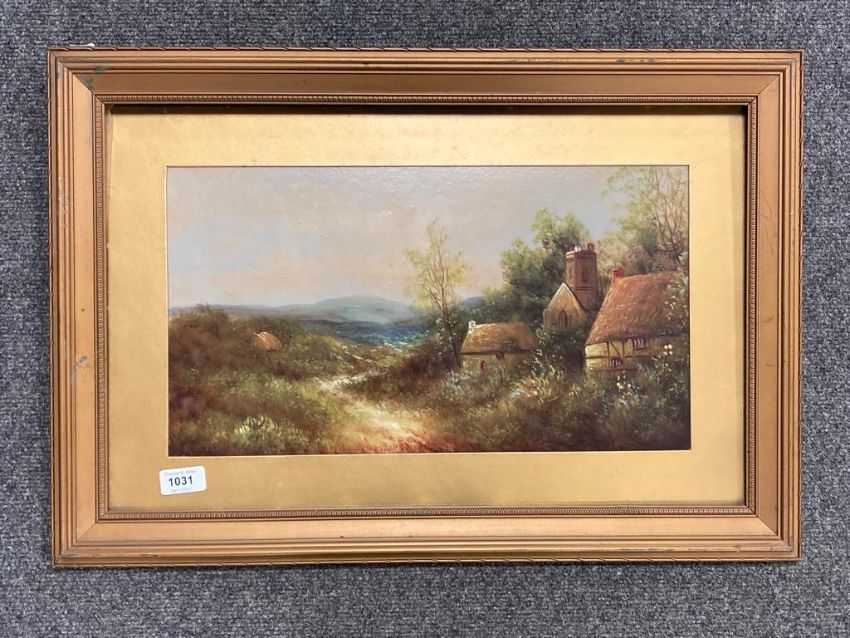 Early twentieth century school : Thatched buildings by a church, oil on board, together with the companion piece, 45 cm x 25 cm, framed. (2)