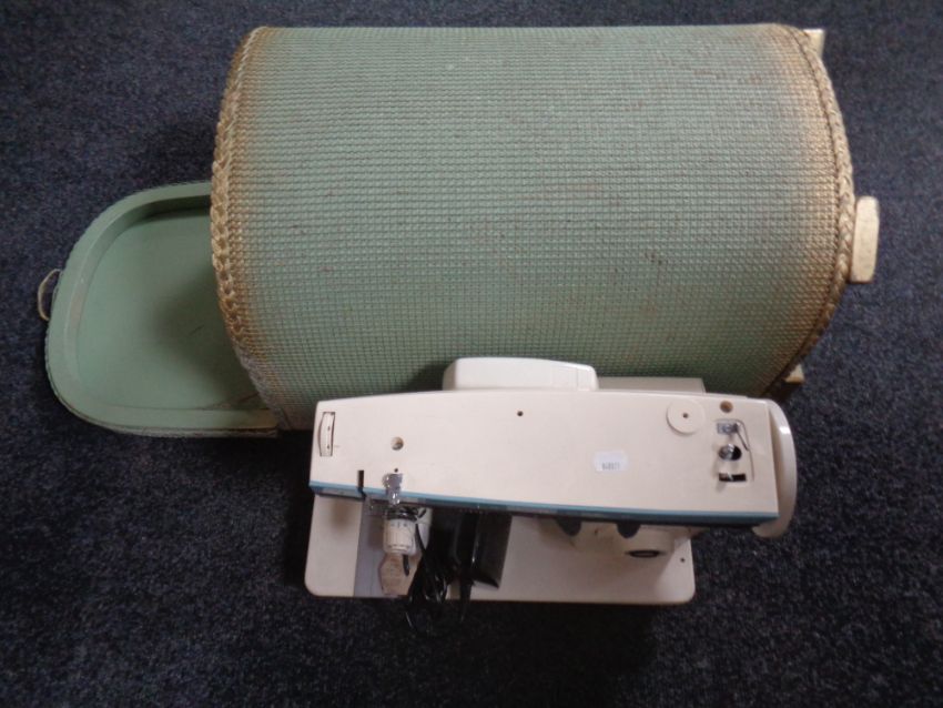 A Singer electric sewing machine with foot pedal together with a green loom linen box