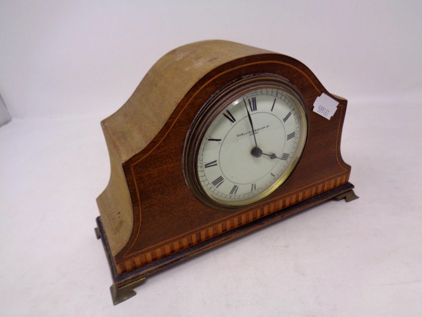 An Edwardian inlaid mahogany mantel clock retailed by Evelyn Bishop Limited of Leeds, on raised brass feet
