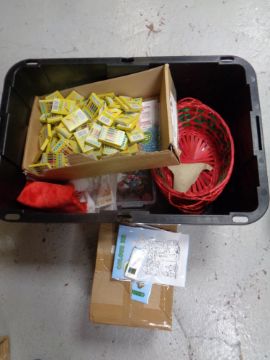 Four boxes and a crate containing Colour Me packs, Christmas hats, crayons etc