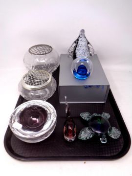 A tray containing assorted glassware to include glass animal paperweights, glass shallow bowl, cut glass rose bowls