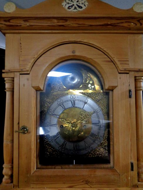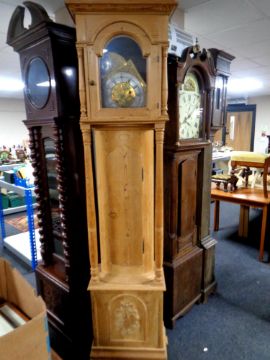 A continental stripped pine longcase clock with brass dial, pendulum and weights