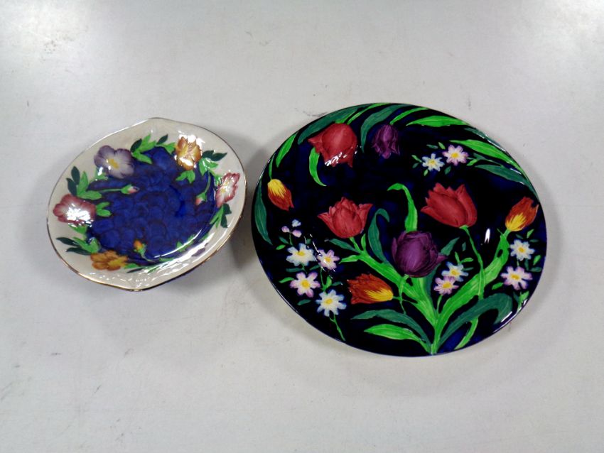 A Maling black tulips plate, diameter 28.5 cm, together with a further Maling lustre dish