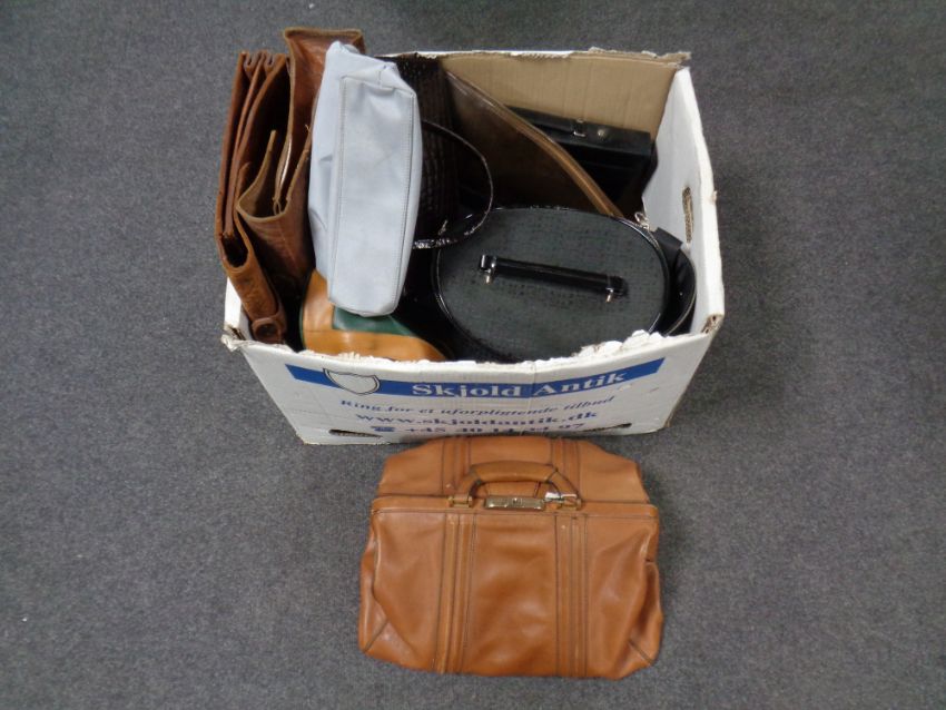 A box containing a quantity of assorted lady's handbags, laptop bag, vanity cases, brown leather style Gladstone bag