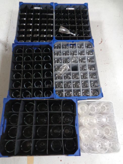 Nine storage crates and stacking crates containing pub glassware to include wine glasses, champagne flutes etc