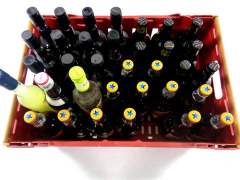 A crate containing miscellaneous alcohol and cocktail syrups to include Grenadine, Pimm's, Limoncello, together with 12 bottles of Newcastle Brown Ale Tyne Bridge Limited Edition Ale (out of date) and eight bottles of alcohol free Kopperberg