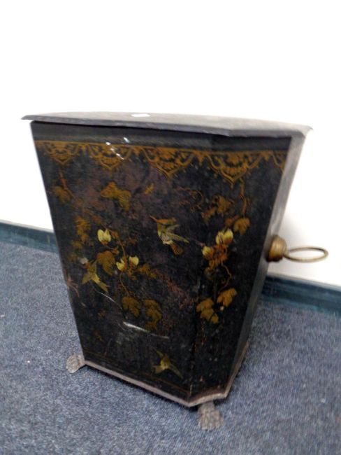 A 19th century toleware twin handled coal bin with floral decoration on raised paw feet