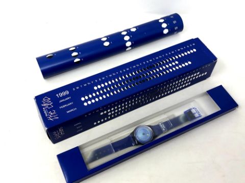 A Swatch QZ160 Space Dreams wristwatch in box.