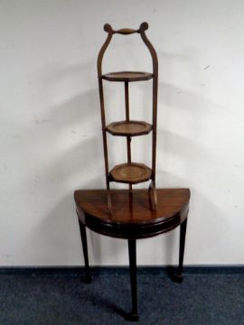 An Edwardian beech wood folding cake stand together with a demi lune table