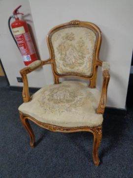 A carved beechwood French salon armchair upholstered in a tapestry fabric