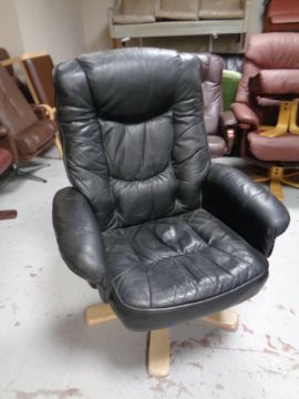 A late 20th century swivel armchair upholstered in black leather