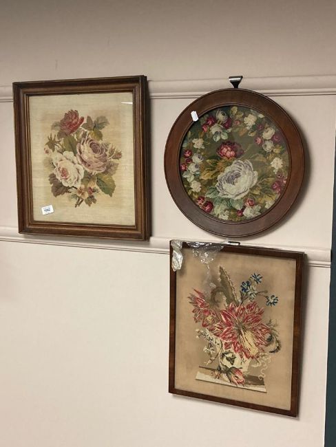 Three nineteenth century needlework embroideries depicting roses and flowers, framed. (3)