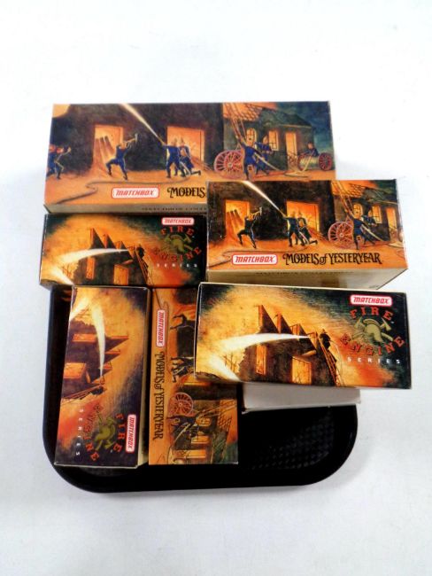 Six Matchbox Models of Yesteryear fire engine series, die cast vehicles, boxed, together with a further Matchbox Model of Yesteryear self propelled fire engine