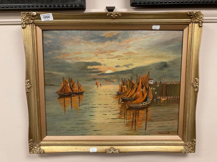 E Hardcastle : Boats at sunset, oil on board, 47 cm x 37 cm, framed.