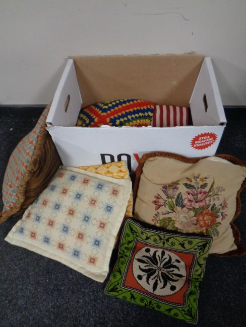 A box containing a woolen throw and tapestry cushions