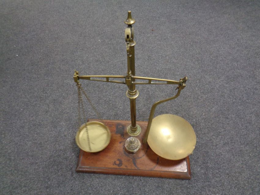 A set of 19th century brass balance scales with weights mounted on a mahogany board