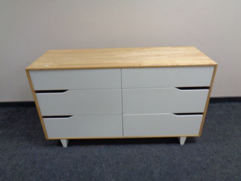 A contemporary pine effect six drawer chest