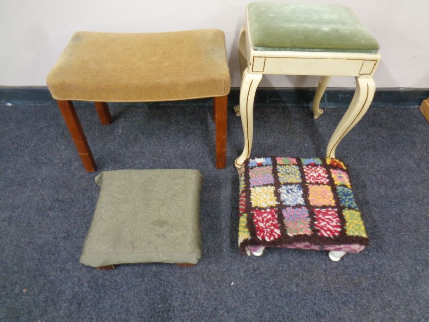 An antique painted dressing table stool on cabriole legs together with a further dressing table stool and two footstools