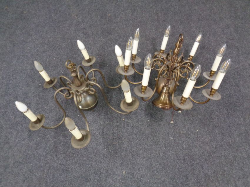 A continental brass eight brass chandelier and a further chandelier