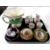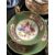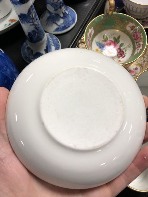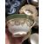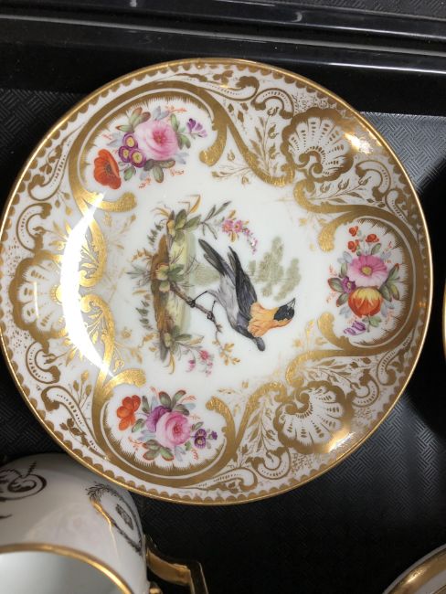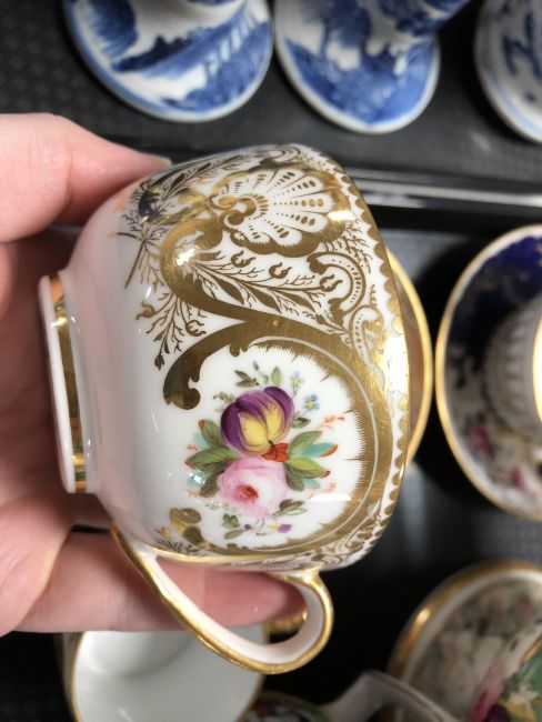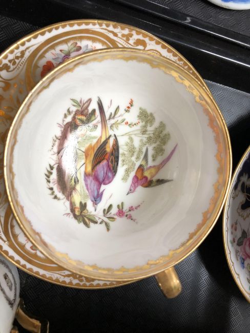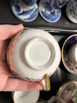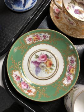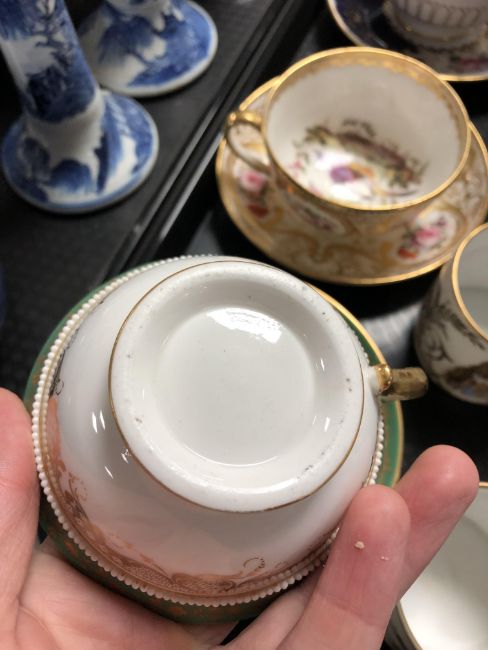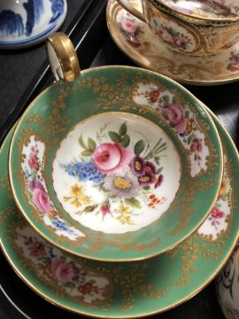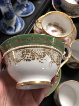 Tea cups on gold and green ground in good condition with some surface wear. No marks or stamps.