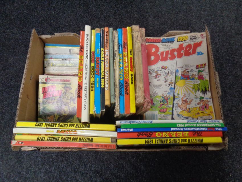 A box of 20th century Commando pocket comics, Buster and 2000AD comics, annuals of The Beano, Dandy etc