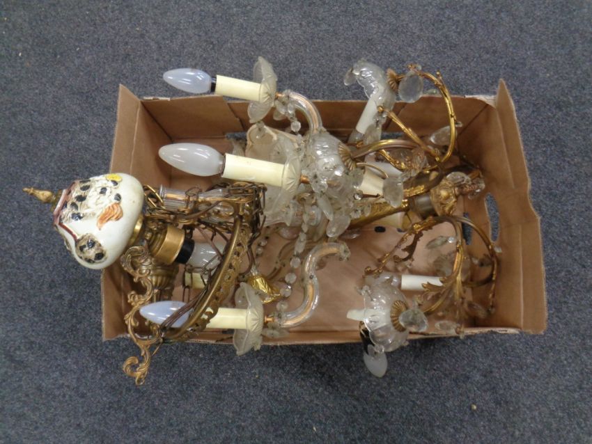 An antique brass six branch chandelier with glass drops, hanging oil lamp (no shade) and a further chandelier