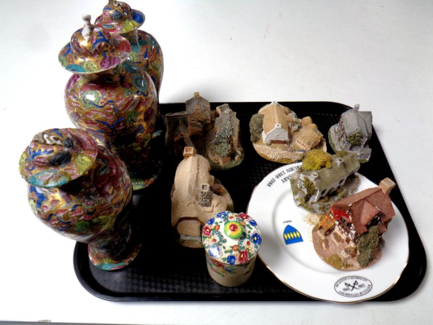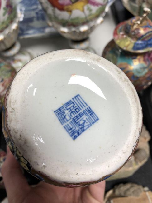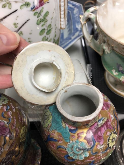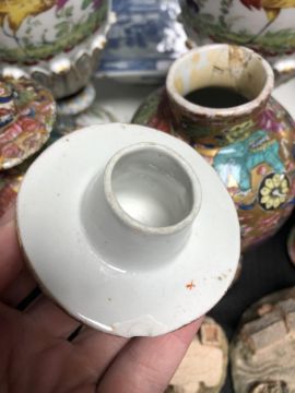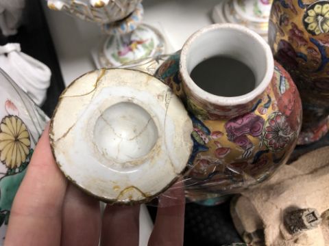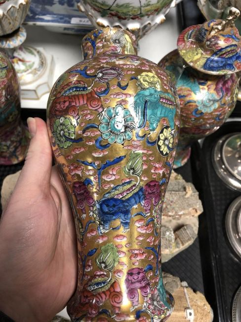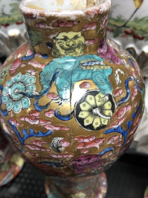 Chinese vases - One vase completely smashed and reglued. Other two vases with broken lids and heavy wear to gilding. See images. Tallest 25cm.