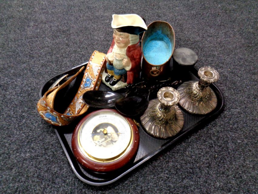 A tray of tooled leather belt and buckle, circular barometer, pair of plated candlesticks, Sylvac toby jug, etc