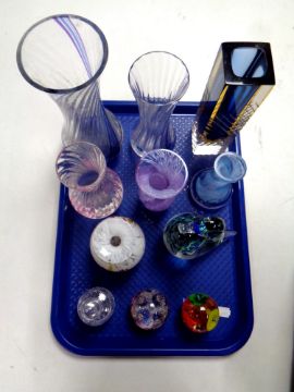 A tray of assorted glass ware : Caithness vases, Art Glass vase, paperweights