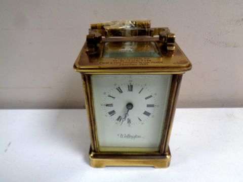 A Wellington brass cased presentation mantel clock with key