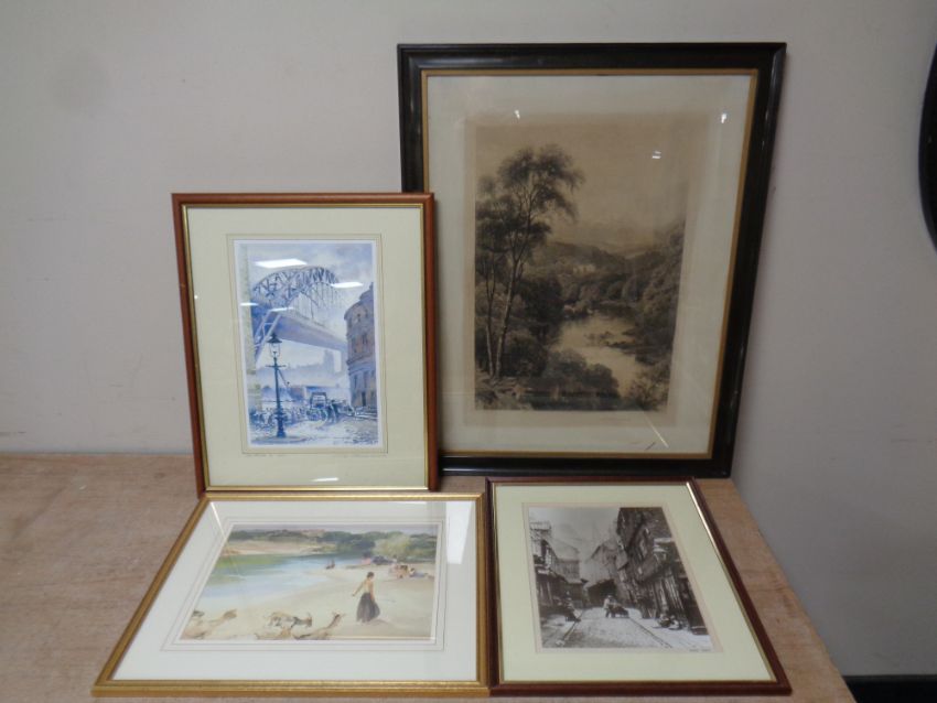 A signed Roy Francis Kirton print : Tyne Bridge, three other antique and later framed pictures
