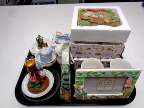 A tray of a collection of Beatrix Potter nursery china : Royal Albert milk jug, basin, Border Fine Arts photo frame, World of Beatrix Potter plaques and candlesticks