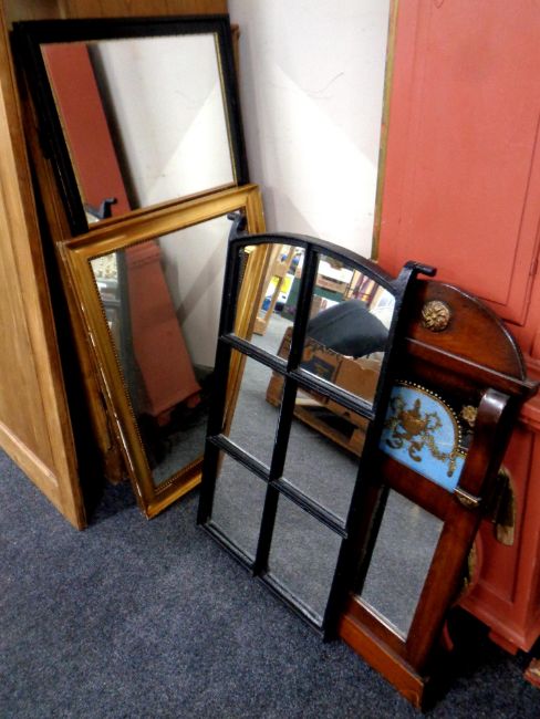 A 19th century mahogany mirror and glass panel, framed as one, together with a wrought iron framed sectional mirror, and two further framed mirrors