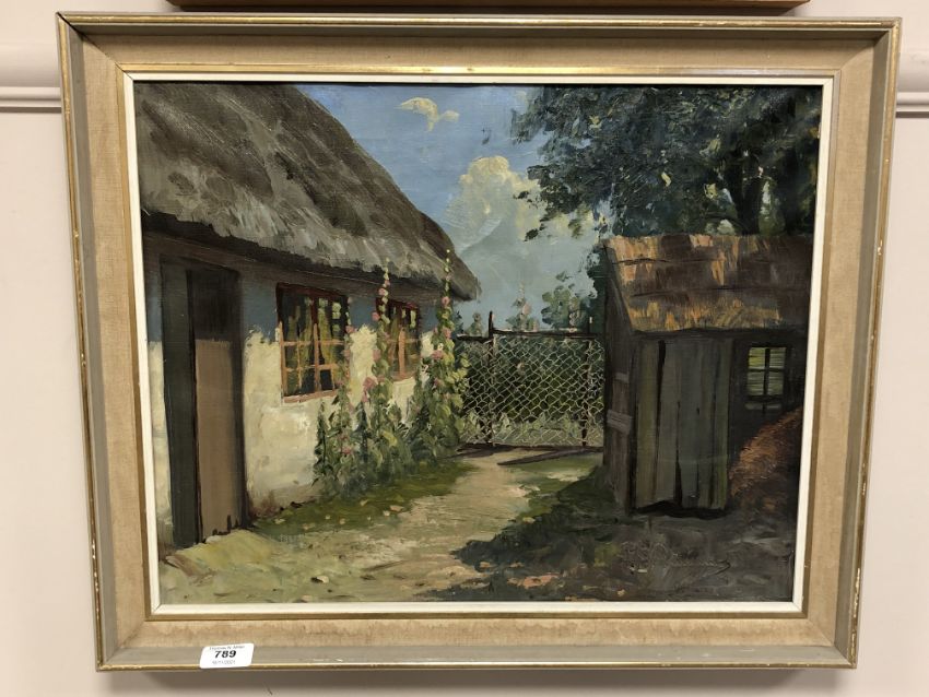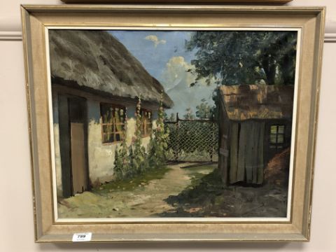 Continental school : A thatched cottage in summer, oil on canvas, 49 x 39 cm