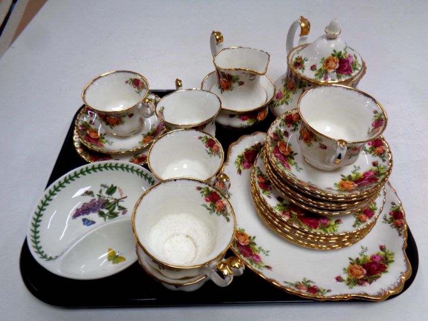A tray of twenty two pieces of Royal Albert Old Country Roses china and a further Portmeirion dish