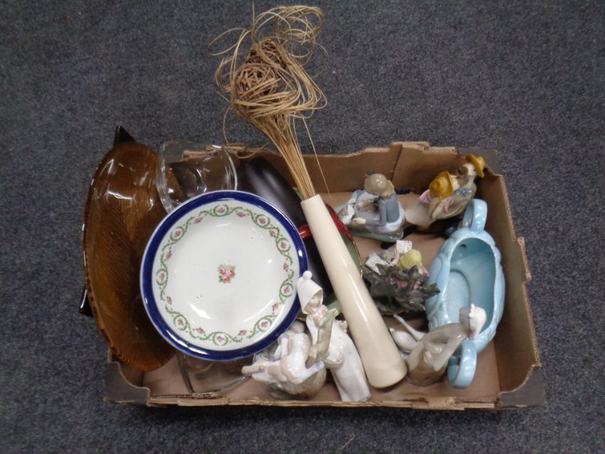 Box of miscellania : Nao and Lladro figures, Maling basket, vase, etc