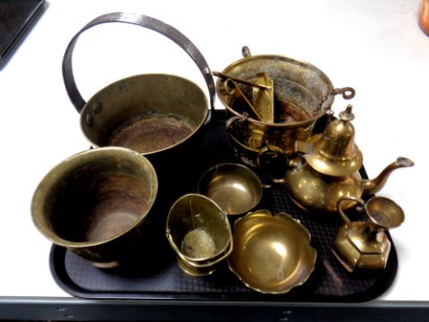 A tray of antique and later metal ware : cast iron handled jam pan, planters, Eastern teapot, flat iron on stand