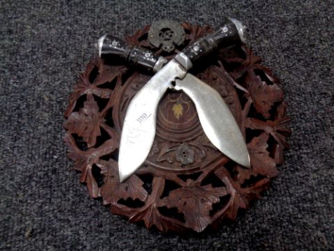 Two miniature Gurkha kukri knives mounted on a hardwood board