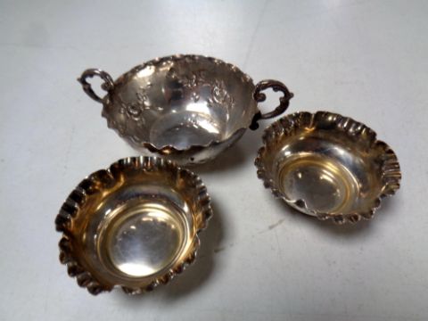 A silver twin-handled wine tasting cup together with a pair of silver salts.