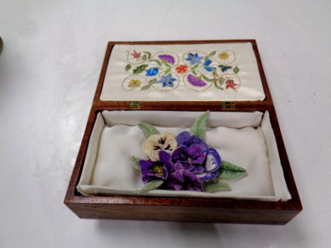 An antique inlaid trinket box with flower embroidery insert