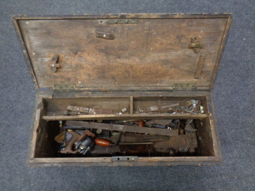 An antique pine tool chest and a quantity of hand tools : wood working planes, level brace, door locks etc