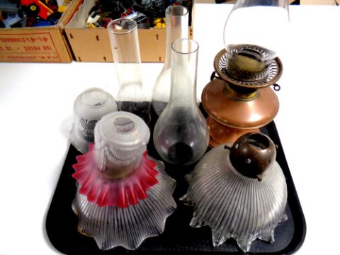 A tray of antique copper and brass oil lamp base with chimney together with three further oil lamp chimneys and four further glass light shades.