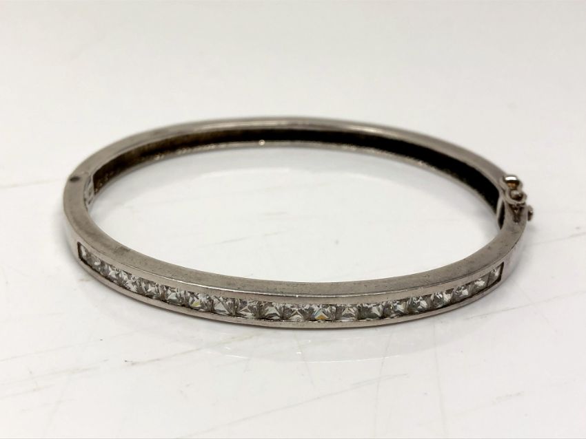 A silver bangle with channel set stones