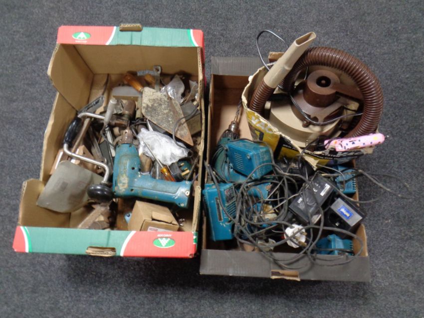 Two boxes of assorted power and hand tools : car vacuum, Makita drill (as found) with charger etc