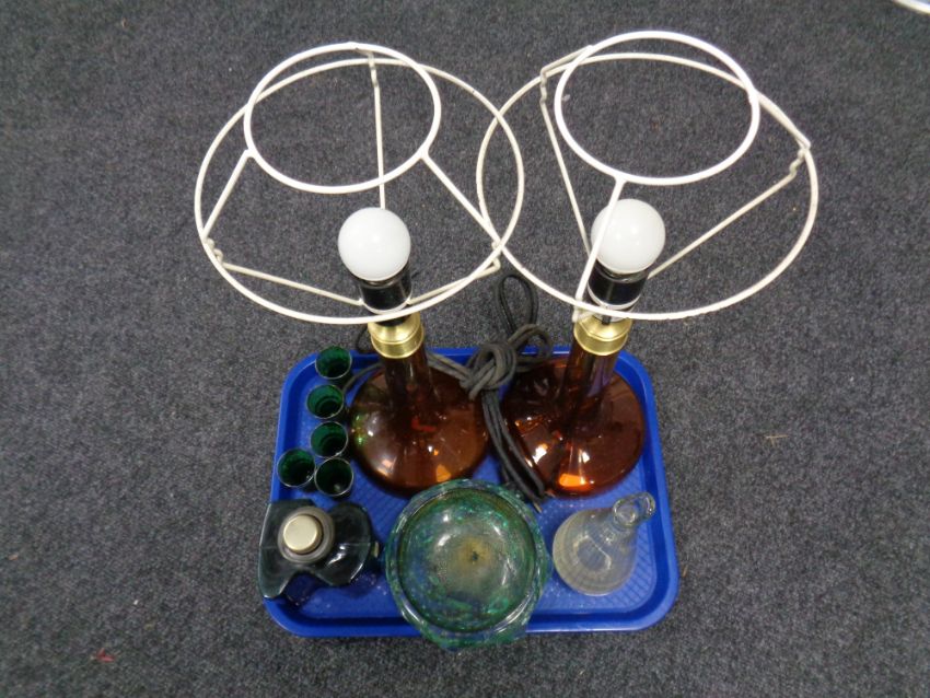 A tray of antique and later continental glass ware : decanter and glasses, pair of amber glass table lamps, iridescent glass dish etc