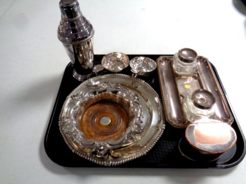 A tray of antique and later plated wares to include wine tasting cups, cocktail shaker, desk stand, wine coaster etc.
