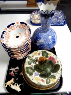 A tray of antique and later ceramics : Fenton blue and white vase, six piece 19th century serving dish set, miniature carved wooden and resin animals