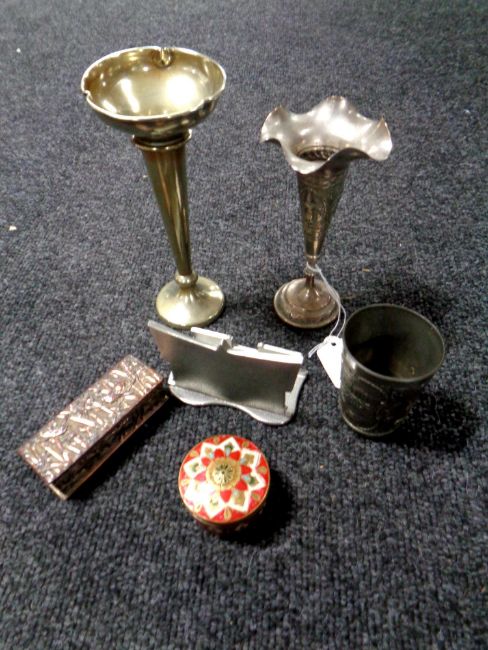 An Indian embossed white metal vase together with further, brass enamelled pot, further bud vase etc.