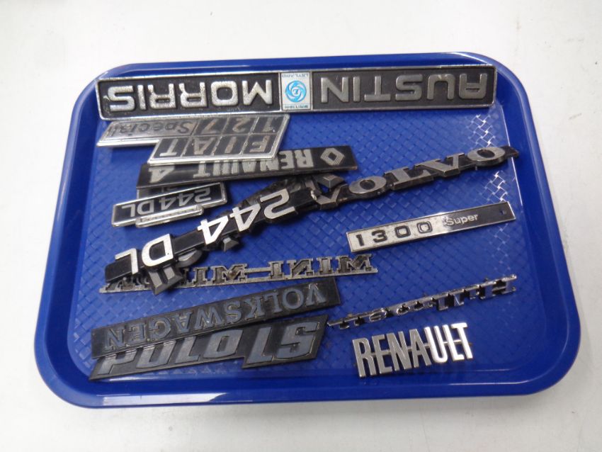 A tray of metal and plastic car badges : Volvo, Austin, Morris, Renault, Ford etc