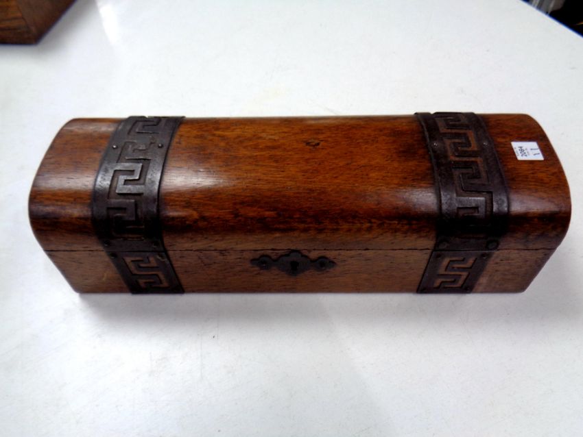 A domed topped jewellery box with metal mounts